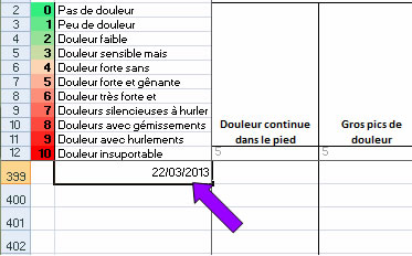Entrez les intensités des différentes douleurs, (valeurs de 0 à 10). Vous remarquerez que les champs se colorent du vert au rouge en fonction de la douleur, les colonnes "Douleur Moyenne" et "Element de douleur le plus fort" se remplissent automartiquement.
